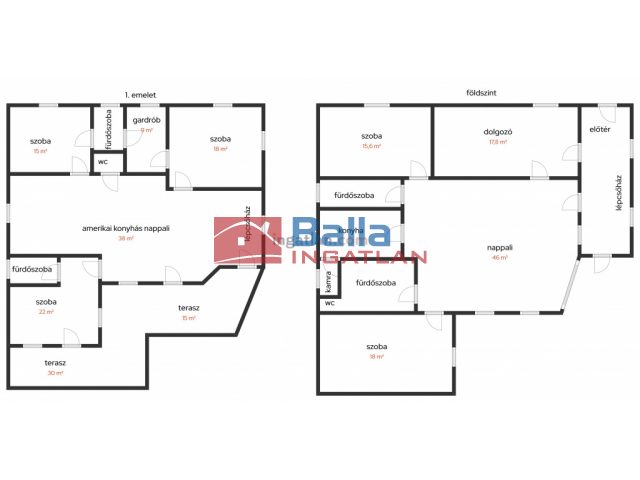 Egyéb tulajdonságok: kandalló, terasz (45 m²), pince, gardróbszoba, kamra, külön wc, garázs